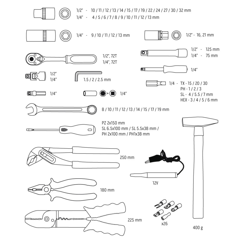 Obsah sady: velikost 1/2"; 13 kusů nástrčných hlavic: 10,11,12,13,14,15,17,19,22,24,27,30,32 mm; univerzální kloub 1 ks; 2ks zásuvek na svíčky: 16 , 21 mm; 1ks prodloužení: 125 mm; 1ks ráčny; velikost 1/4": 10ks nástrčných hlavic: 4,5,6,7,8,9,10,11,12,13 mm; 5ks dlouhých nástrčných hlavic: 9,10,11,12,13 mm; univerzální kloub 1 ks: prodloužení 1 ks: 50 mm: 1ks: ráčna; 1ks: držák bitů; 1ks: adaptér; 13ks: bity: TX: 15,20 ,30; PH: 1,2,3; HEX: 3,4,5,6 mm; FD: 4,5,5,7 mm; 9 ks otevřených klíčů: 8,10,11,12,13,14,15,17,19 mm; 3 ks klíčů HEX:1,5, 2, 2,5 mm; 1 ks klíče na trubky 250 mm; 1 ks krimpovací kleště; 1 ks kladivo; 1 ks univerzální kleště; 5 ks šroubováků: PZ2x150 mm, FD6x100 mm, FD5x38 mm PH2x100 mm PH1x38 mm; 1 ks testeru; 26 ks. Krimpovací hroty