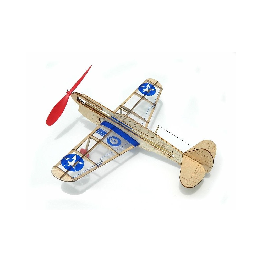 Rychlostavebnice stínové polomakety P-40 Warhawk o rozpětí 286mm s pohonem gumovým svazkem z laserem vyřezávaných balsových dílů.