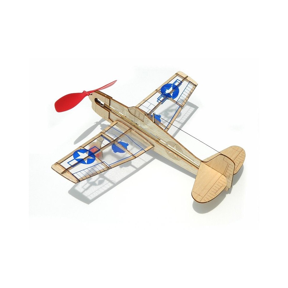 Rychlostavebnice stínové polomakety F6F Hellcat o rozpětí 260mm s pohonem gumovým svazkem z laserem vyřezávaných balsových dílů.