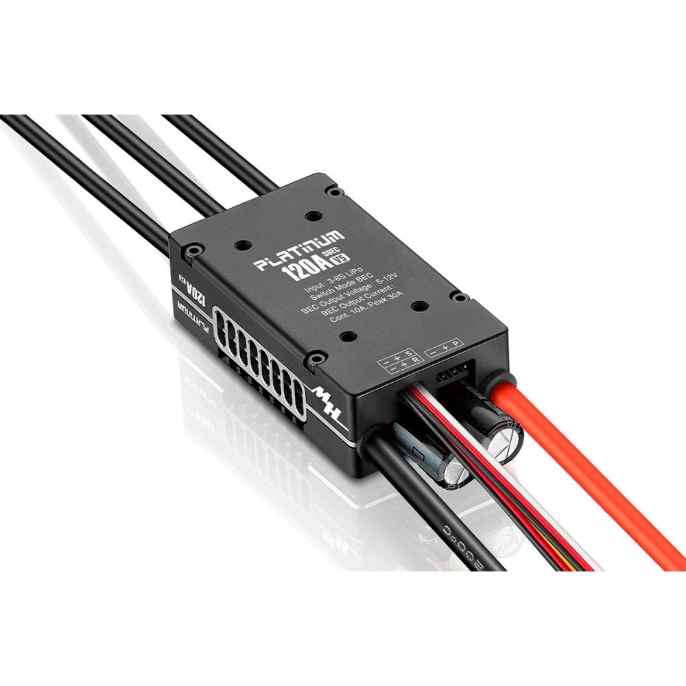 Nejvyšší řada regulátorů firmy Hobbywing pro letecké aplikace. Tato verze je vhodná pro vrtulníky řady 420-520 a modely letadel třídy .50-.70. Spínaný BEC 5-12V 10A. Trvalý proud 120A, špičkový 150A. Napájení 3-8S LiPo. Hmotnost 150,4g. Rozměry 83,2x37,1x22,5mm.