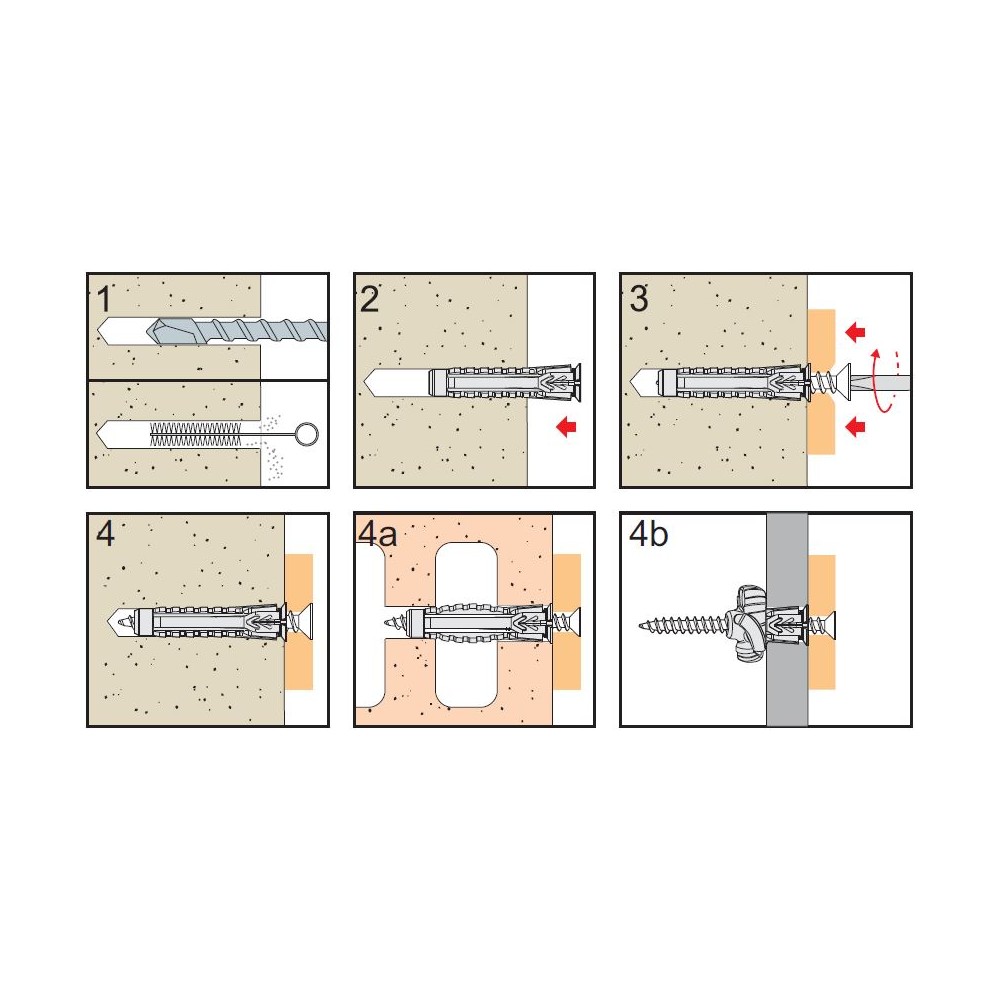 Nylonová uzlovací hmoždinka X1 je speciálně vytvořena pro kotvení do plných, dutinových i plošných materiálů (např. sádrokarton). Dodržujte následující postup: