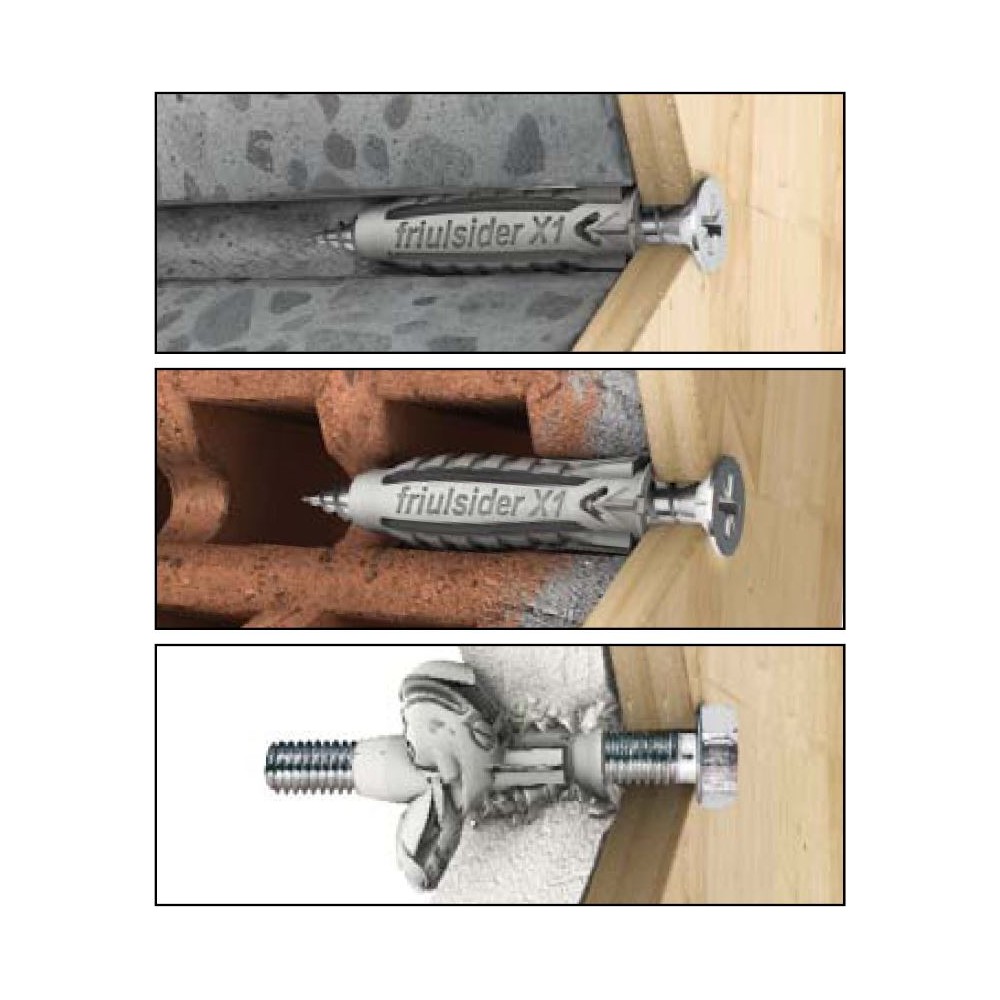 Šest protidrážek pro kvalitní adhezi v otvoru s diferencovanou expanzí pro kotvení v okrajích - to je špičková uzlovací hmoždinka Friulsider X1.