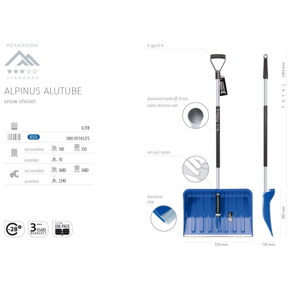 Shrnovač sněhu ALPINUS ALUTUBE má odolný plast. Mezi jeho vlastnosti patří mrazovzdornost, odolný teplotám až do -18°C.