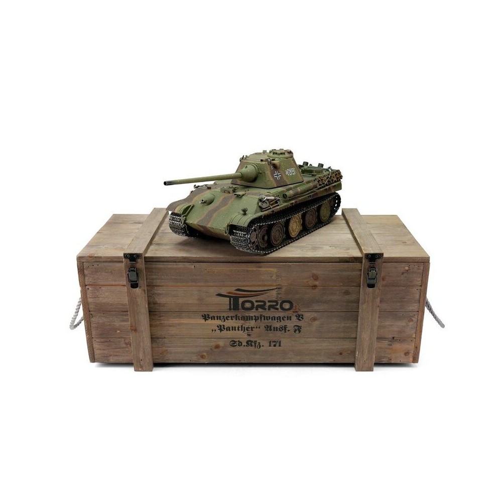 S hmotností kolem šesti kilogramů je Panther F ideální pro náročného zákazníka. V profesionální edici se vyznačuje vynikající kvalitou barvy airbrush, technologií desek plošných spojů 2,4 GHz a novým reproduktorem. Tento model má vynikající jízdní vlastnosti, širokou škálu funkcí a realistický zvuk. Vysoce kvalitní pásy, hnací a vodicí kola s válečky, stejně jako spodní část trupu a bojová věž jsou vyrobeny z kovu. Mnoho malých dílů a různých samolepek dokonale završuje repliku věrného měřítka.
