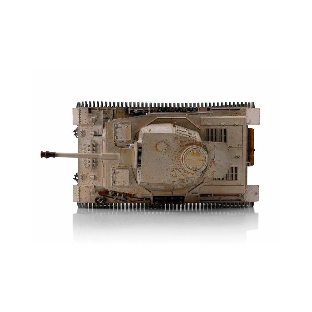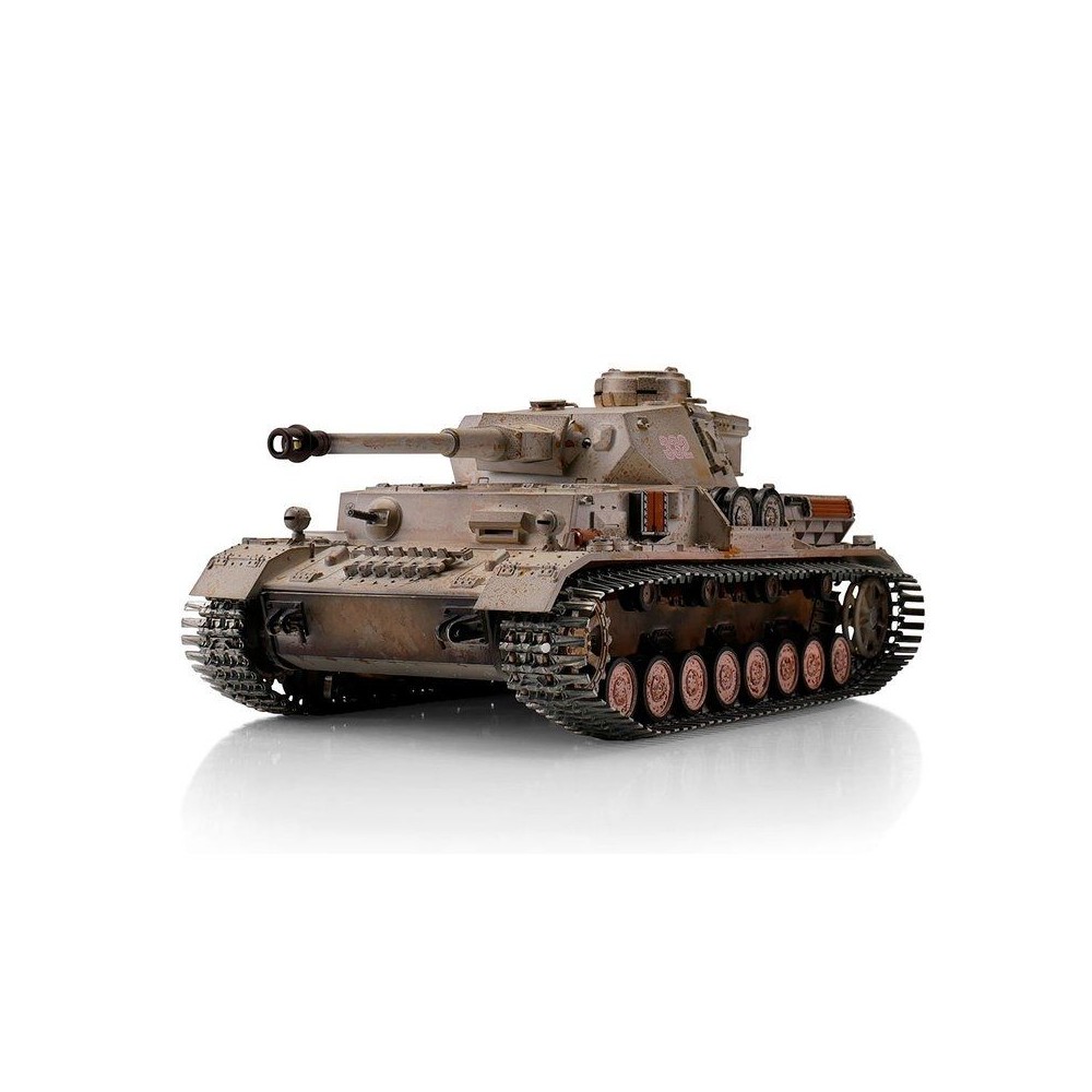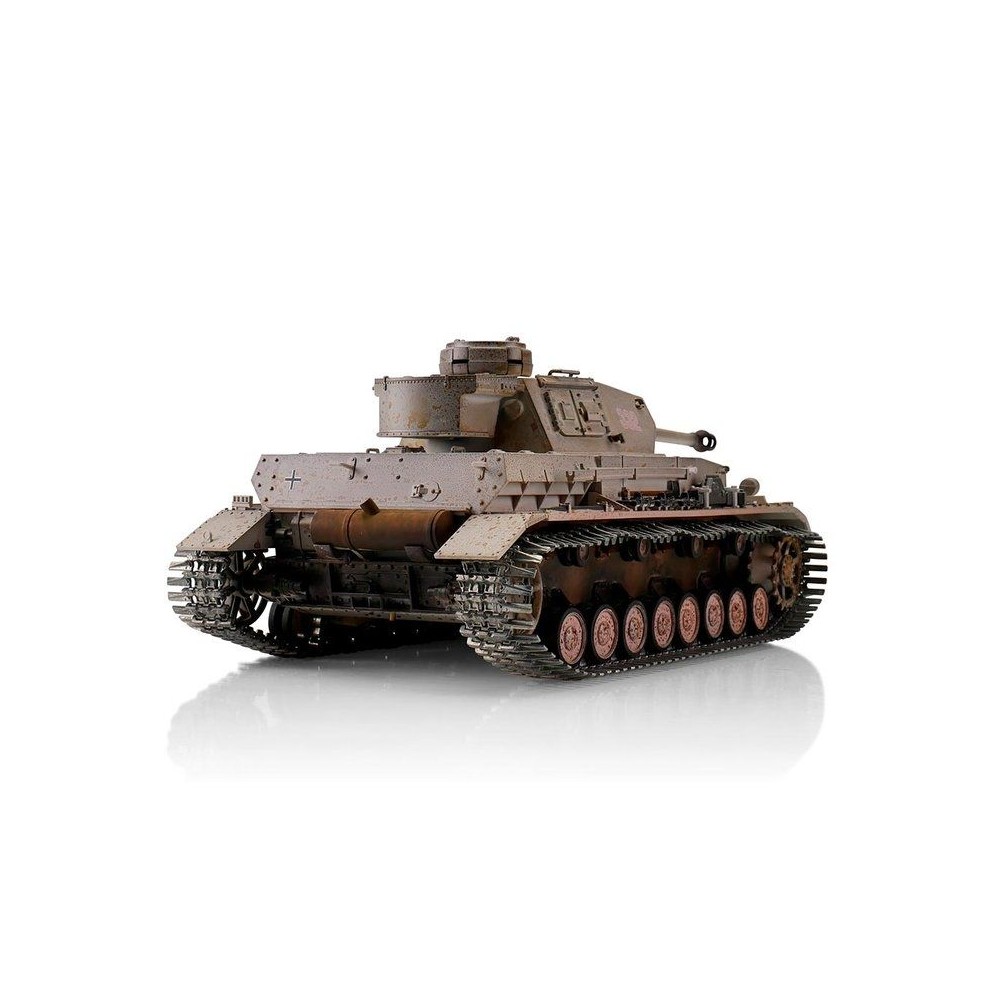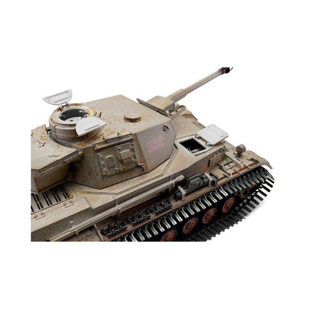 Výkonný model tanku má RC ovládání 2,4 GHz. Vozidlo je vybaveno IR bitevním systémem, takže jsou možné bitvy s vozidly ze stejné série. Motory s optimalizovaným točivým momentem dodávají modelu PzKpfw IV Ausf. G kamufláž přesnou a plynulou jízdu. Kovové převody s robustními převody a vylepšeným převodem zajišťují větší výkon. Díky proporcionálnímu ovládání se můžete s tankem přiblížit velmi pomalu a plynule zvyšovat rychlost. PzKpfw IV Ausf. G kamufláž se pohybuje dopředu a dozadu, také s otočením doleva a doprava. Lze jej také na místě otočit doleva nebo doprava. Můžete zvednout a spustit dělo a otočit věž o 360 stupňů. Realistický zážitek završují různé zvuky motoru, zpětný zákluz hlavně, záblesk hlavně a kouř z výfuku.