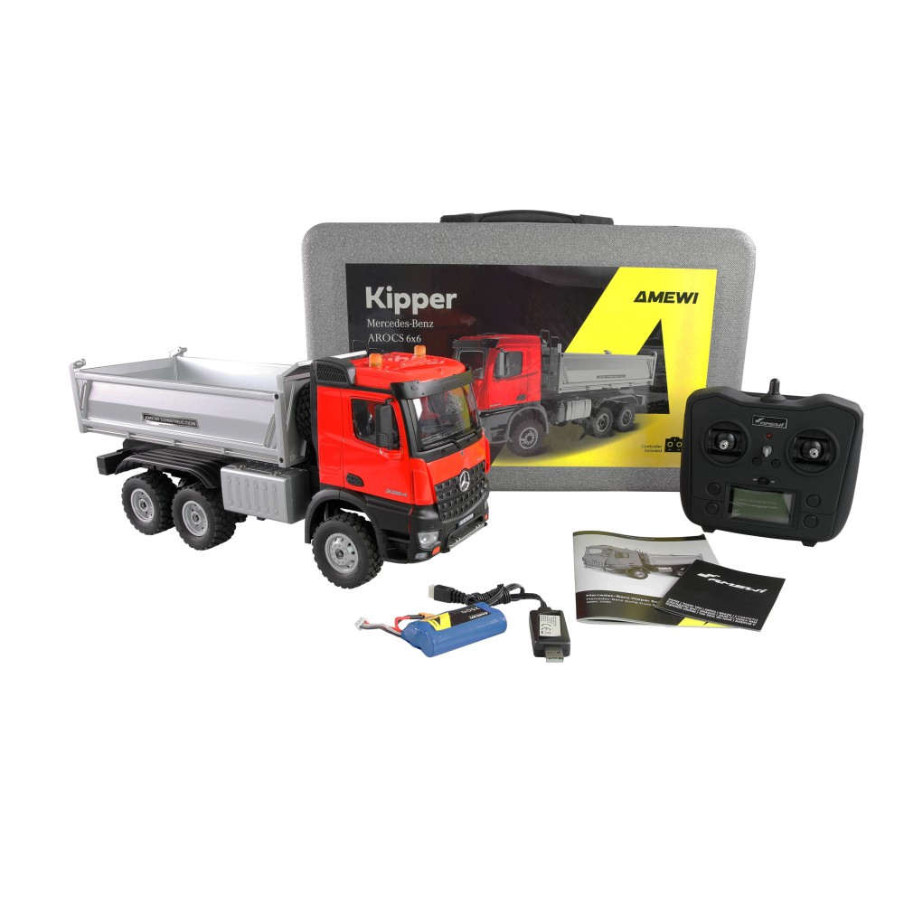 RC kovový sklápěč MB Arocs, 6WD, 1:14, RTR, 2,4 GHz, LED osvětlení, zvukový modul, oficiální licencovaný model, kovové kardanové hřídele, diferenciály na přední nápravě a obou zadních, plně proporcionální, barva červená.