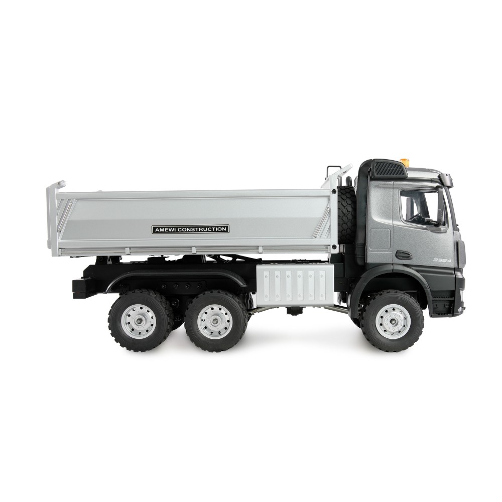 RC kovový sklápěč MB Arocs, 6WD, 1:14, RTR, 2,4 GHz, LED osvětlení, zvukový modul, oficiální licencovaný model, kovové kardanové hřídele, diferenciály na přední nápravě a obou zadních, plně proporcionální, barva antracit.