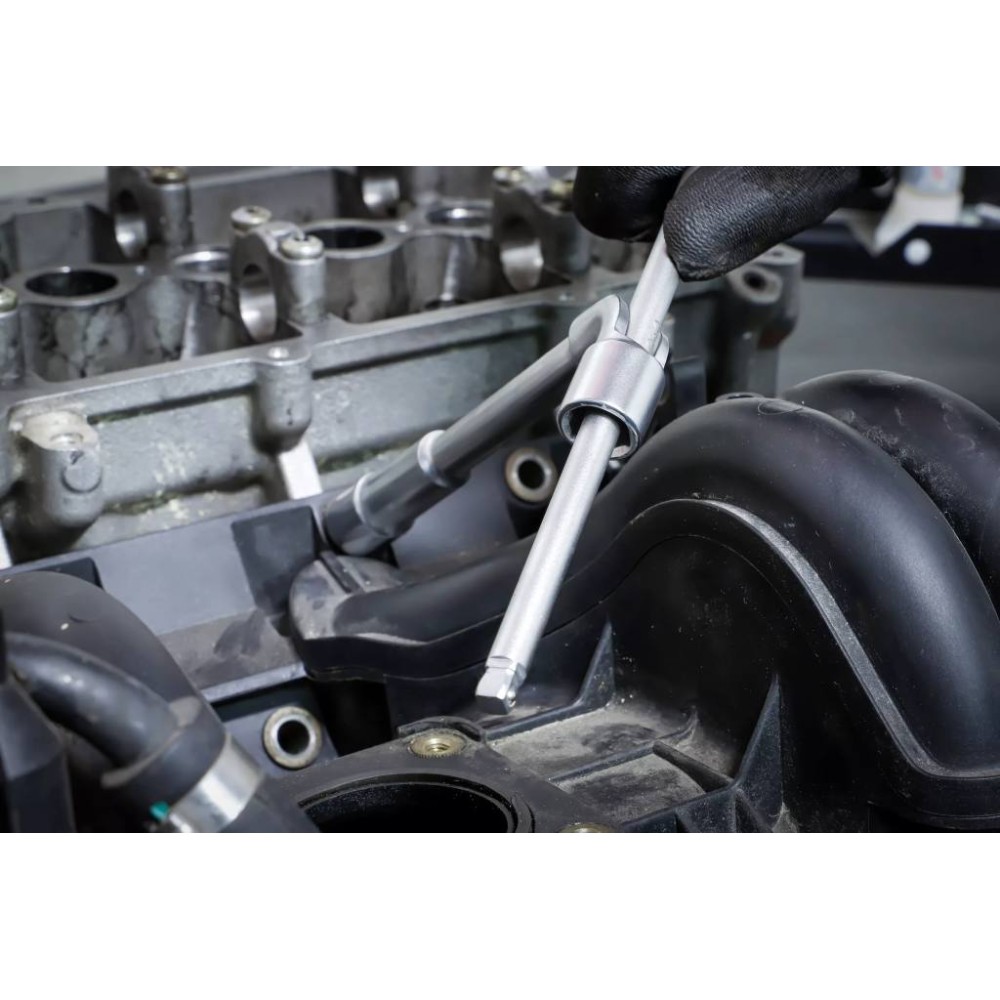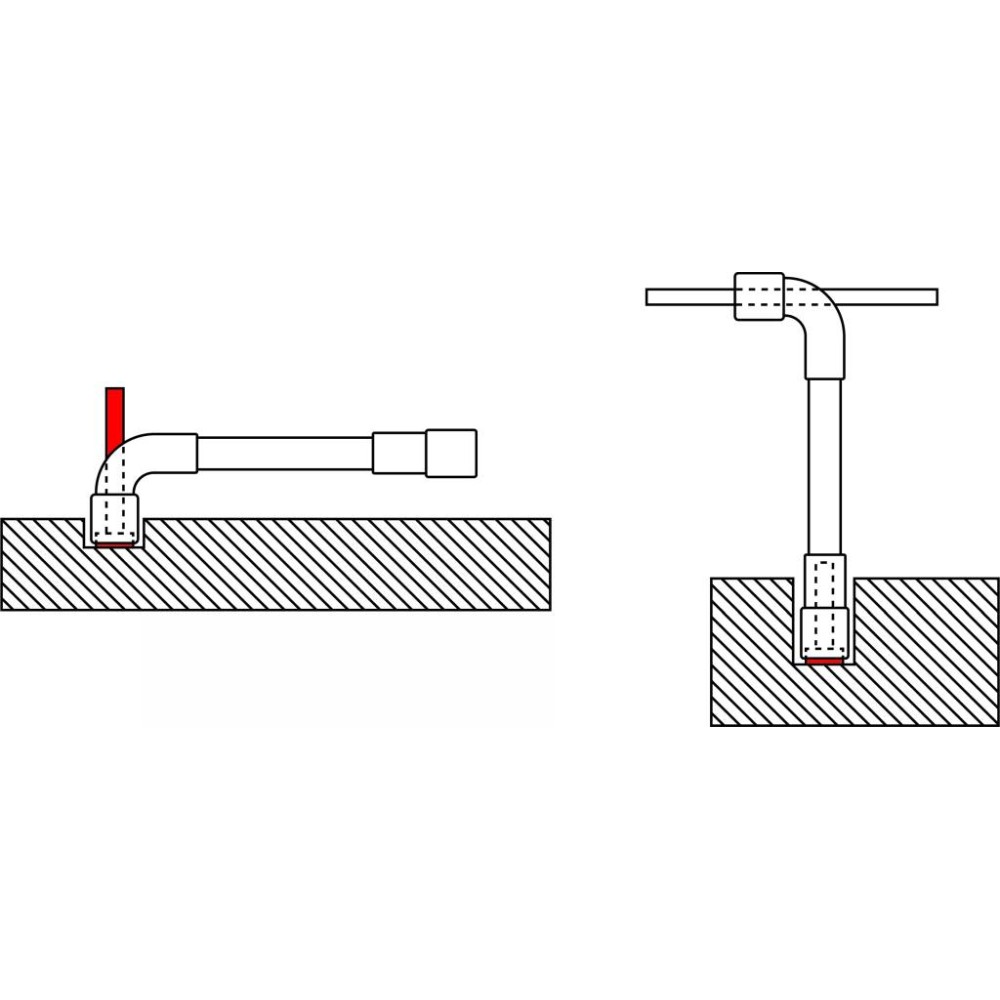 Vhodné zejména pro podpěrné čepy a matice uložené hluboko na závitových tyčích, kde se nedá použít běžný očkový klíč v zalomeném provedení.