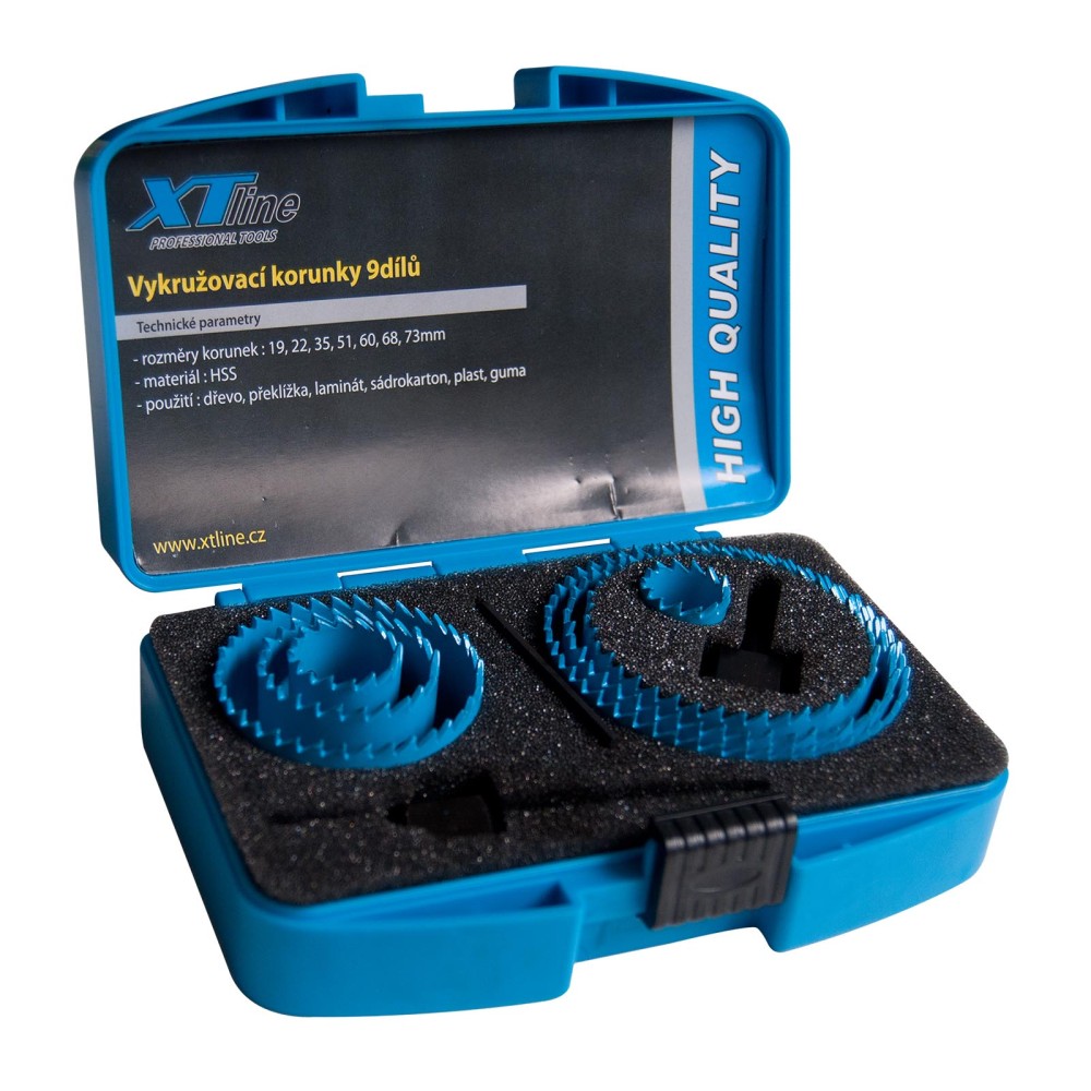 Sada 7 vykružovacích korunek a vodícího vrtáku se dvěma upínacími stopkami je kompletněvyrobena z HSS oceli. Rychlá výměna stopky pro menší nebo větší korunku pomocí přiloženéhoimbusového klíče. Určeno pro vrtání otvorů do dřeva, překližky, laminátu, sádrokartonu, plastu a gumy.