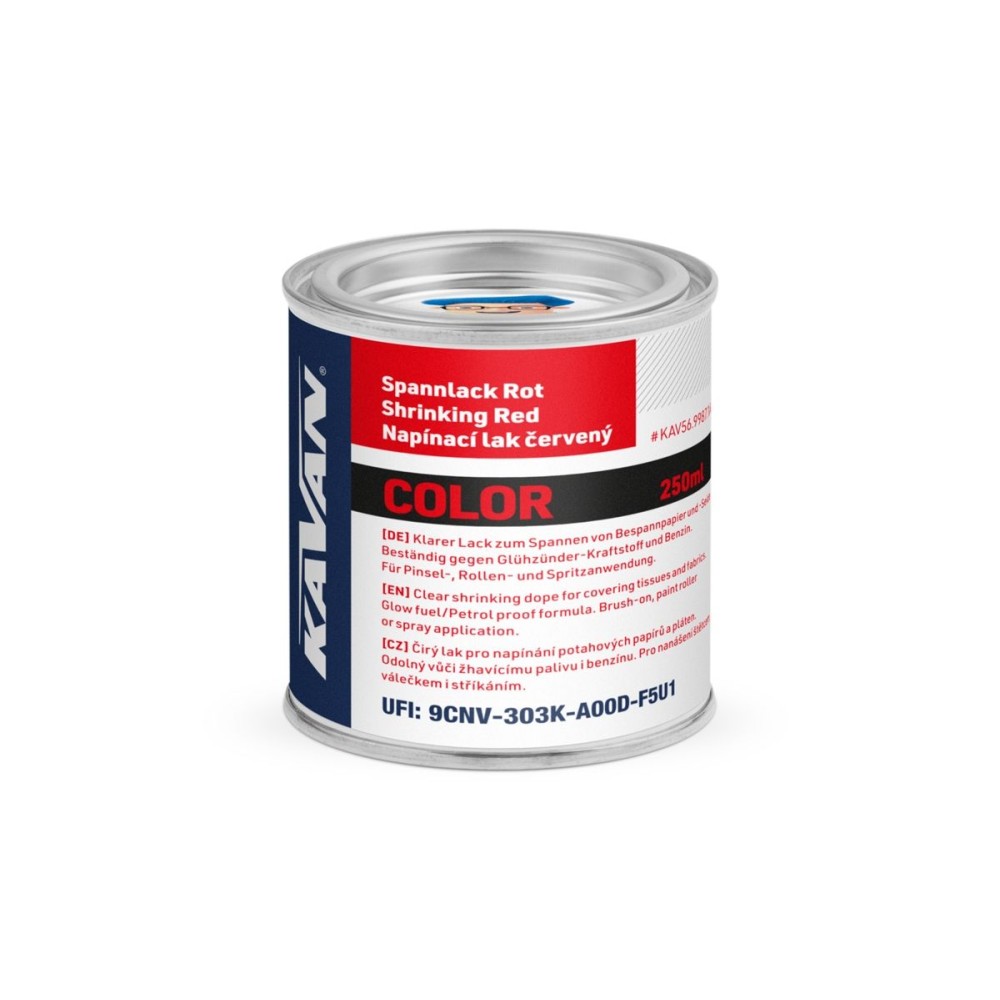 Červený napínací nitrolak pro napínání potahových papírů a pláten odolný vůči žhavícímu palivu i benzínu. Pro nanášení štětcem, válečkem nebo stříkáním. Balení plechovka 250 ml.