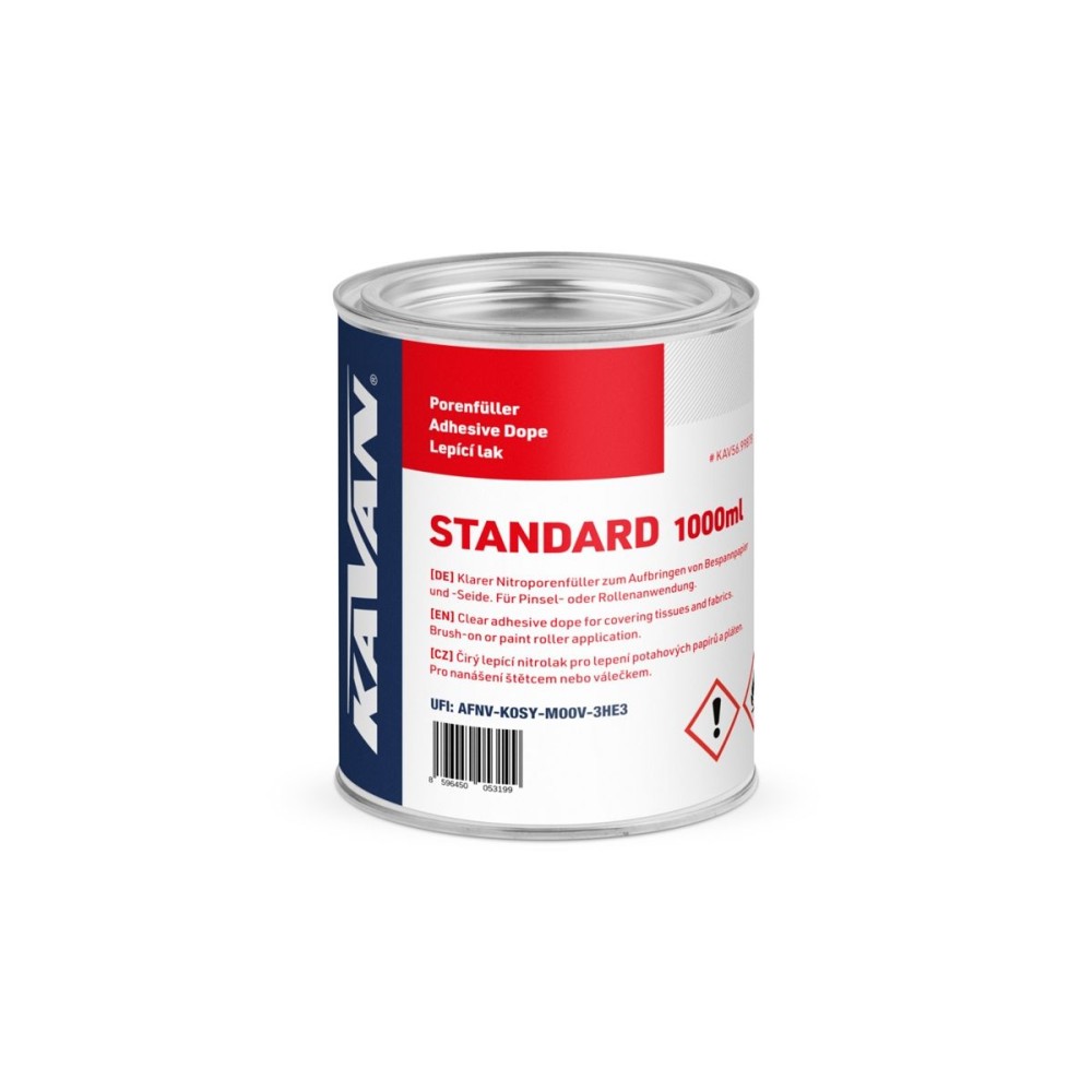 Použití: Zpravidla se nanáší neředěný (je-li třeba, použijte KAVAN Ředidlo STANDARD); na kostru nanášejte měkkým plochým štětcem nebo válečkem. Ihned přitiskněte a přihlaďte potahový papír nebo plátno; případné vzduchové bubliny odstraňte štětcem nebo válečkem. Nechejte vyschnout nejméně 24 hodin a přebruste jemným brusným papírem 600–1000. Při použití na modelu se spalovacím motorem je nutno nanést vrchní krycí vrstvu odolnou vůči palivu (např. KAV56.9990 KAVAN krycí lak POLY, 5MA4401 RC Color bezbarvý lak ve spreji).
