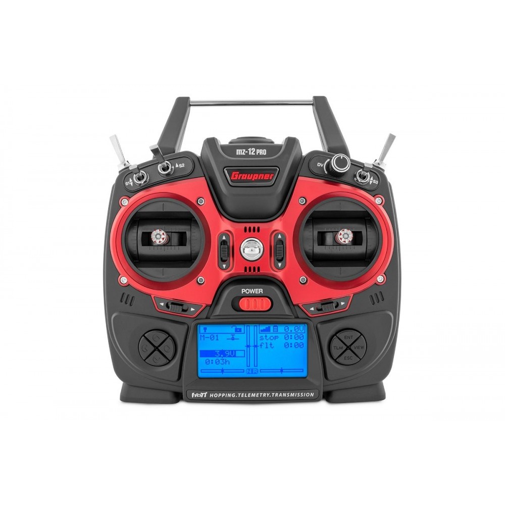 12-kanálová RC souprava se systémem přenosu 2,4 HGz HoTT, s plnohodnotnou telemetrií a 8-řádkovým modře podsvíceným LCD displejem a zcela novým přijímačem Graupner HoTT Falcon 12 se zabudovaným 3-osým stabilizátorem pro modely letadel, vrtulníků a multikopter.