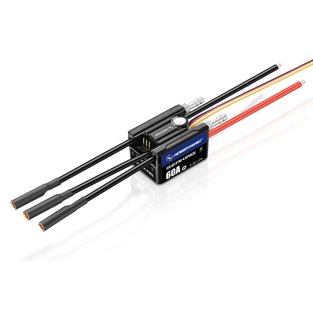 Obousměrný regulátor firmy Hobbywing speciálně určený pro modely lodí. Ideální pro rychlostní čluny do délky 600mm a menší makety. Trvalý proud 60A, špičkový 200A. Spínaný BEC 6,0/7,4V 4A. Napájení 2-3S LiPo. Hmotnost 64,6g. Rozměry 38,7x29x25mm. Vodotěsný a vodou chlazený.