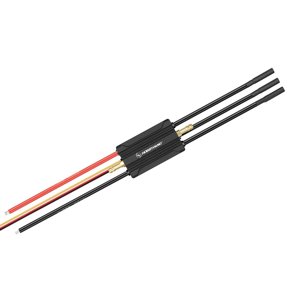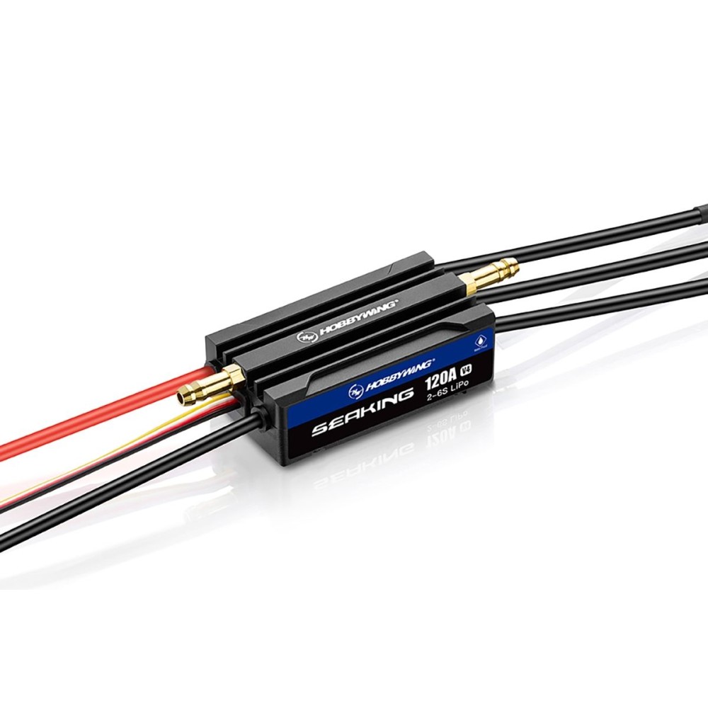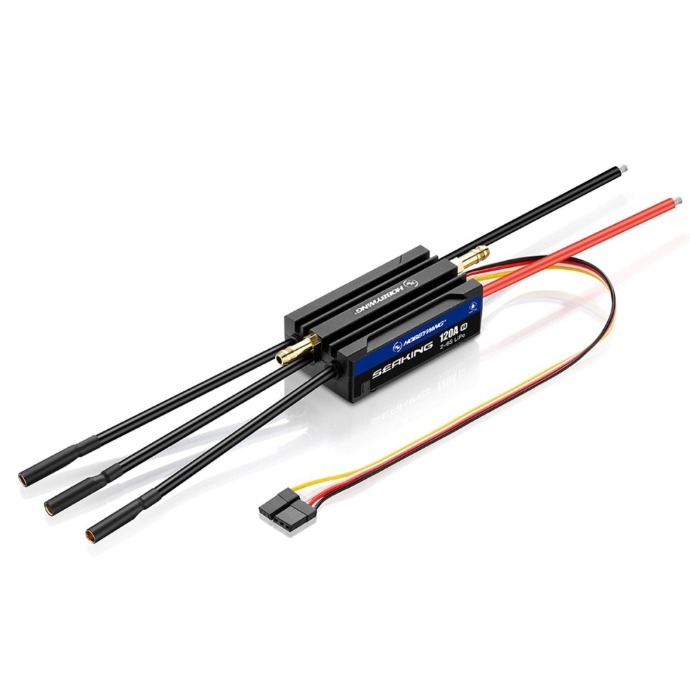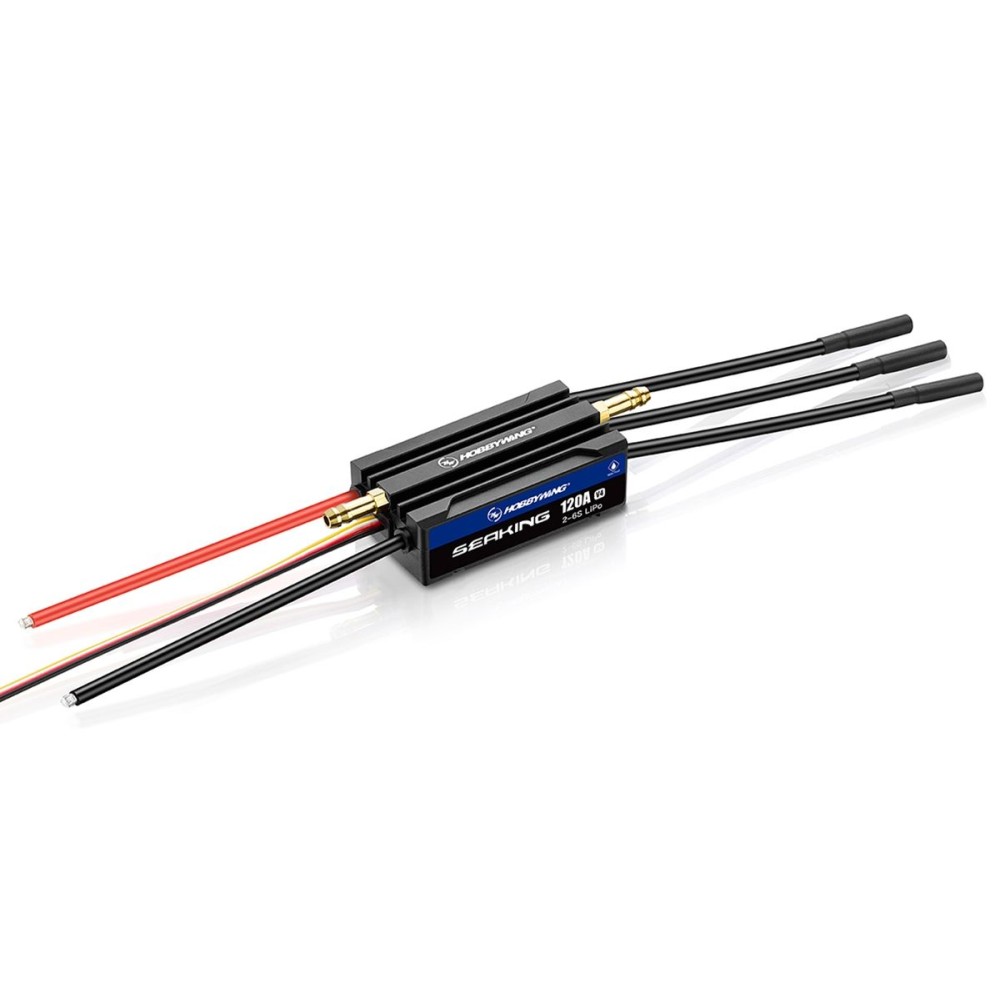 Obousměrný regulátor firmy Hobbywing speciálně určený pro modely lodí. Ideální pro rychlostní čluny do délky 1000mm a makety. Trvalý proud 120A, špičkový 500A. Spínaný BEC 6,0/7,4/8,4V 84A. Napájení 2-6S LiPo. Hmotnost 123,5g. Rozměry 64,7x36,3x22,5mm. Vodotěsný a vodou chlazený.