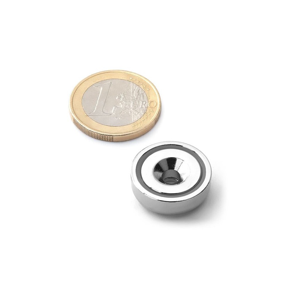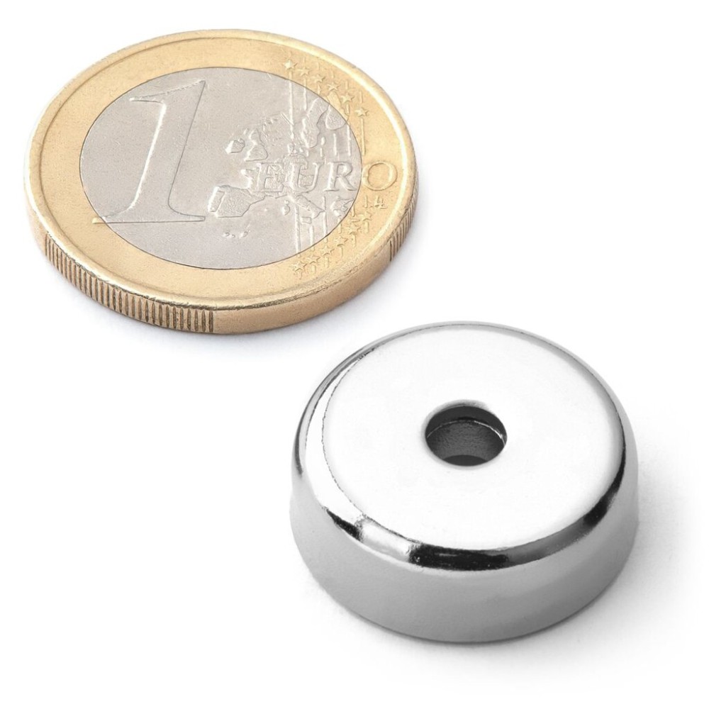 Menší kruhový neodymový magnet s magnetickou silou cca 13 kg má odolné ocelové pouzdro a otvor s prohlubní na šroub M4. Magnet snadno přišroubujete ke stěně, na strop, ke konstrukcím, k předmětům, nástrojům.