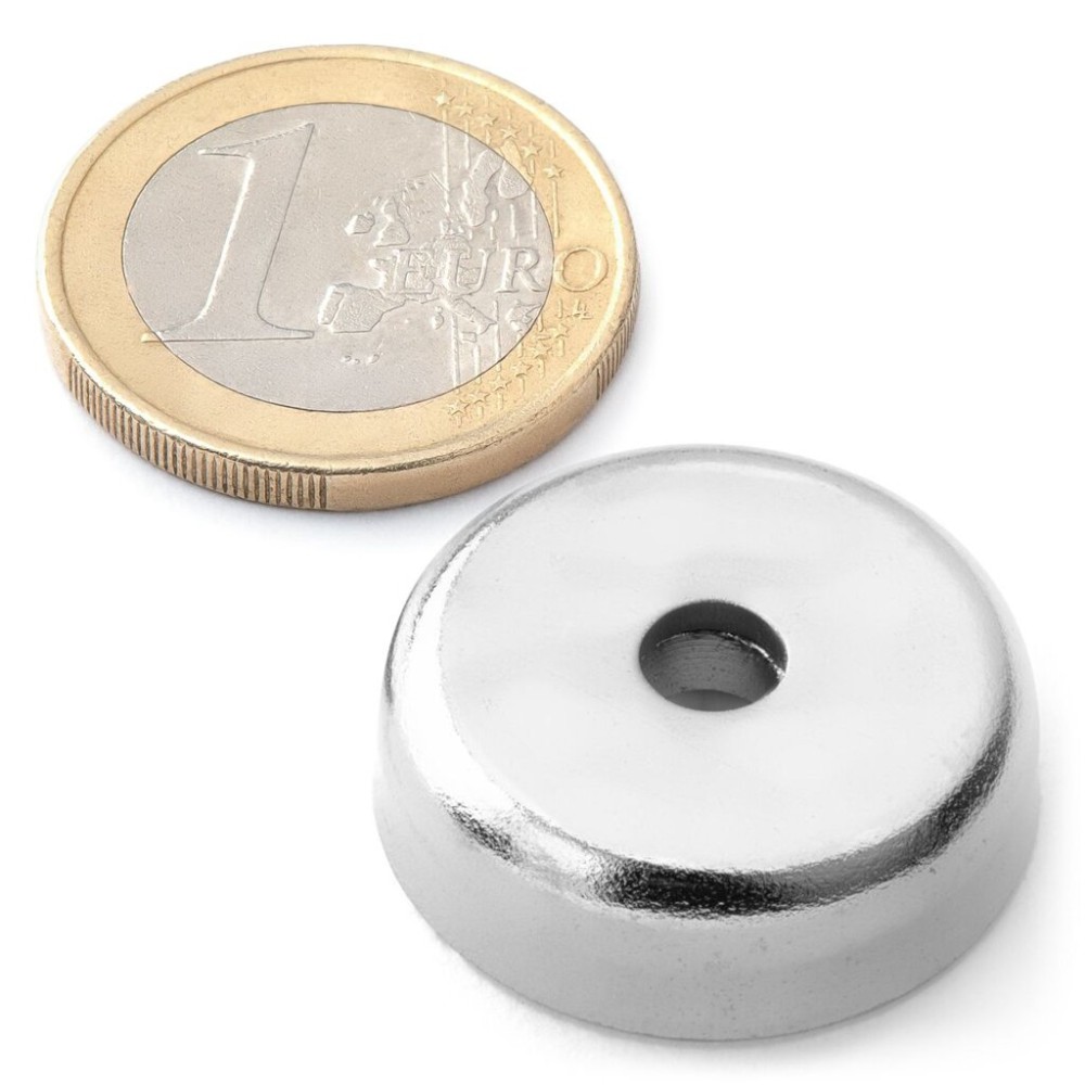 Menší kruhový neodymový magnet s magnetickou silou cca 19 kg má odolné ocelové pouzdro a otvor s prohlubní na šroub M5. Magnet snadno přišroubujete ke stěně, na strop, ke konstrukcím, k předmětům, nástrojům.