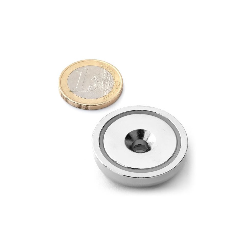 Menší kruhový neodymový magnet s magnetickou silou cca 30 kg má odolné ocelové pouzdro a otvor s prohlubní na šroub M5. Magnet snadno přišroubujete ke stěně, na strop, ke konstrukcím, k předmětům, nástrojům.