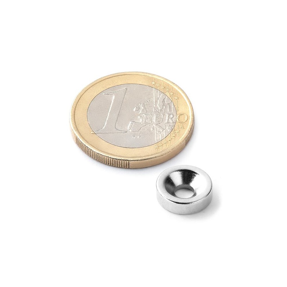 Kruhový magnet O 10/7-3,5 mm, výška 3 mm, neodymový, N38, poniklovaný, síla: cca 1,6 kg, prohlubeň pro šroub M3