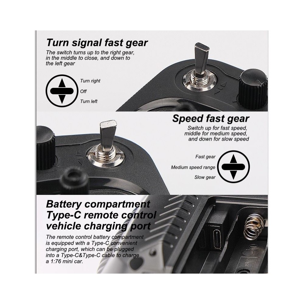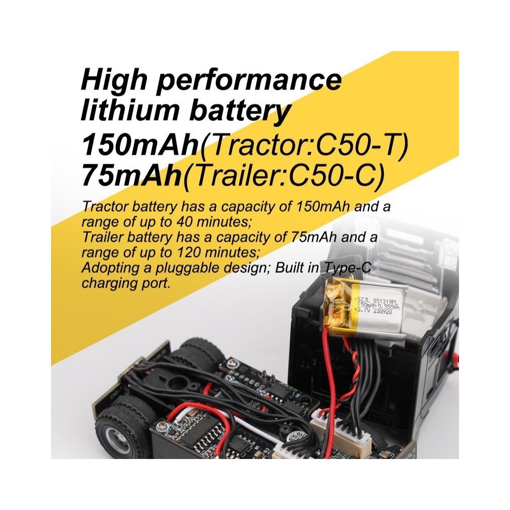Tento RC kamion, připravený k okamžitému použití (RTR), je mezi dálkově ovládanými modely opravdu jedinečným. Model disponuje přesným proporcionálním řízením a ovládáním plynu, jaké byste očekávali od větších RC automobilů, a nabíjí se jako váš smartphone pomocí připojení USB–C. Díky kompaktnímu měřítku 1/76 můžete manévrovat i v těsných prostorech a užívat si radost z vození nákladů s přáteli a rodinou doma, v kanceláři s kolegy, na cestách nebo téměř kdekoli, kde vás jen napadne!