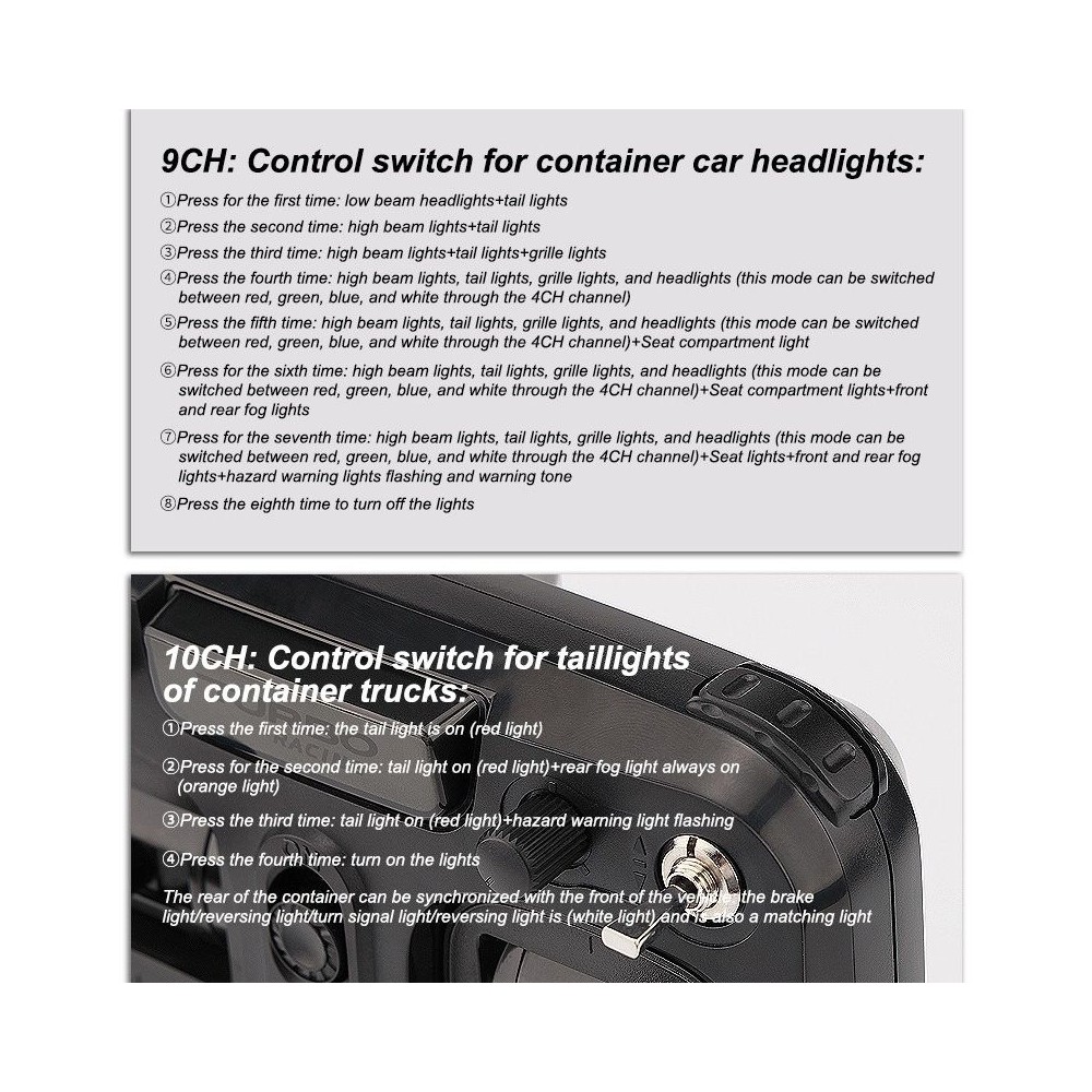 - Zvuky: signál zpátečky, zvuk zatáčení, klakson, zvuk výstražných světel - ovládání kanálem CH6