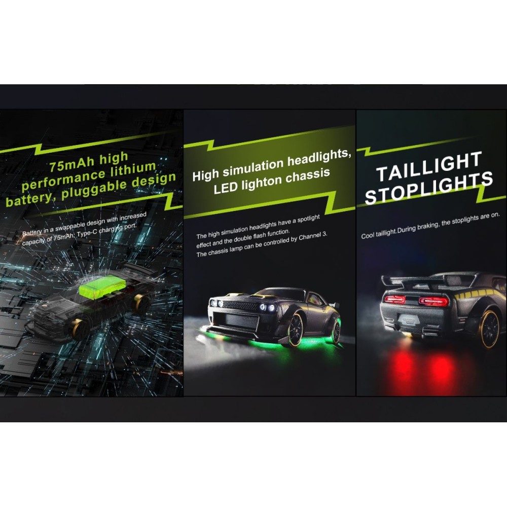 RTR sada 1:76 RC modelu s vysílačem. Plně proporcionální řízení, doba jízdy až 30 minut, přední a zadní světlomety, neony, pohon zadních kol, gyroskop, hmotnost 21 g.
