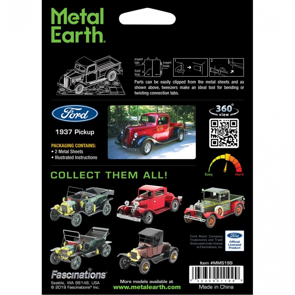 Luxusní 3D ocelová stavebnice Ford Pickup z roku 1937. 2 kovové destičky (11 x 11 cm), počet dílů: 76.