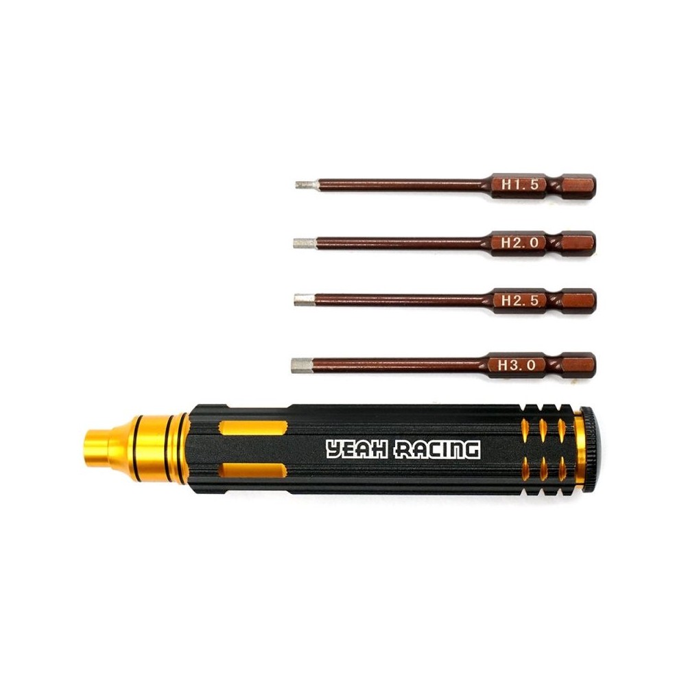 4v1 Sada imbusových šroubováků obsahující 4 šestihranné hroty 1,5 mm, 2,0 mm, 2,5mm a 3,0 mm. Šestihranné hroty jsou uloženy uvnitř krytu rukojeti, což usnadňuje jejich správu a skladování, takže je menší pravděpodobnost jejich ztráty. Magnetizované hroty pro snadné zachycení šroubů.