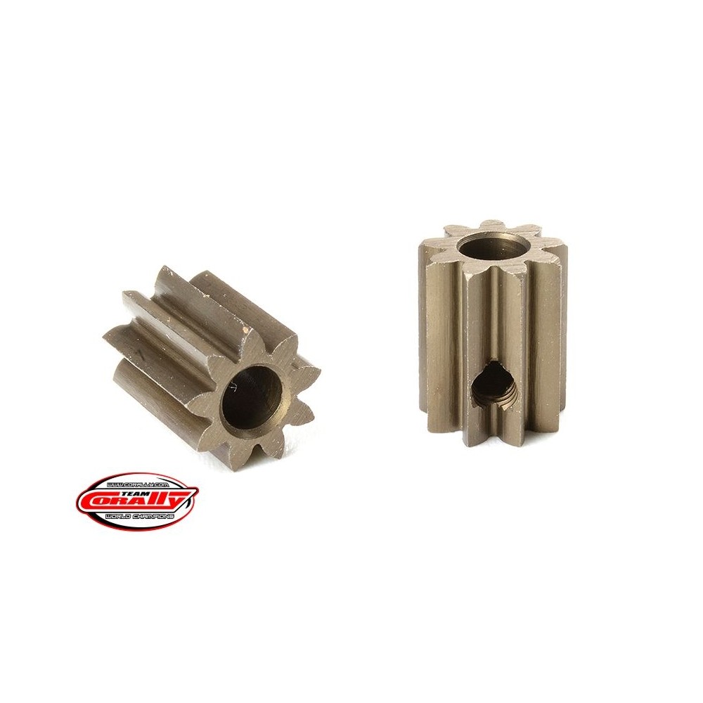 Krátké provedení, materiál tvrzená ocel, 9 zubů, modul ozubení 0.6M. Pro hřídel motoru o průměru 3.17 mm (1/8 in). Pastorky TEAM CORALLY jsou vyráběny frézováním a následně tvrzeny, čímž je zajištěna vysoká přesnost ozubení. Všechny pastorky TEAM CORALLY jsou vyrobeny v EU.