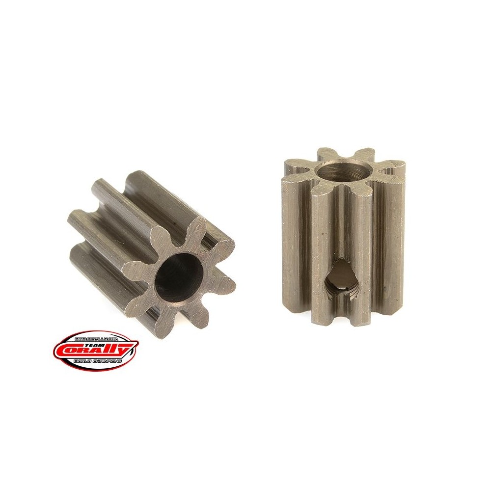 Krátké provedení, materiál tvrzená ocel, 8 zubů, modul ozubení 32DP. Pro hřídel motoru o průměru 3.17 mm (1/8 in). Pastorky TEAM CORALLY jsou vyráběny frézováním a následně tvrzeny, čímž je zajištěna vysoká přesnost ozubení. Všechny pastorky TEAM CORALLY jsou vyrobeny v EU.