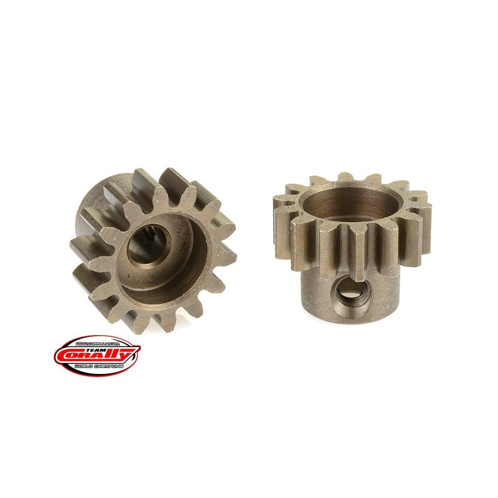 Krátké provedení, materiál tvrzená ocel, 14 zubů, modul ozubení 32DP. Pro hřídel motoru o průměru 3.17 mm (1/8 in). Pastorky TEAM CORALLY jsou vyráběny frézováním a následně tvrzeny, čímž je zajištěna vysoká přesnost ozubení. Všechny pastorky TEAM CORALLY jsou vyrobeny v EU.