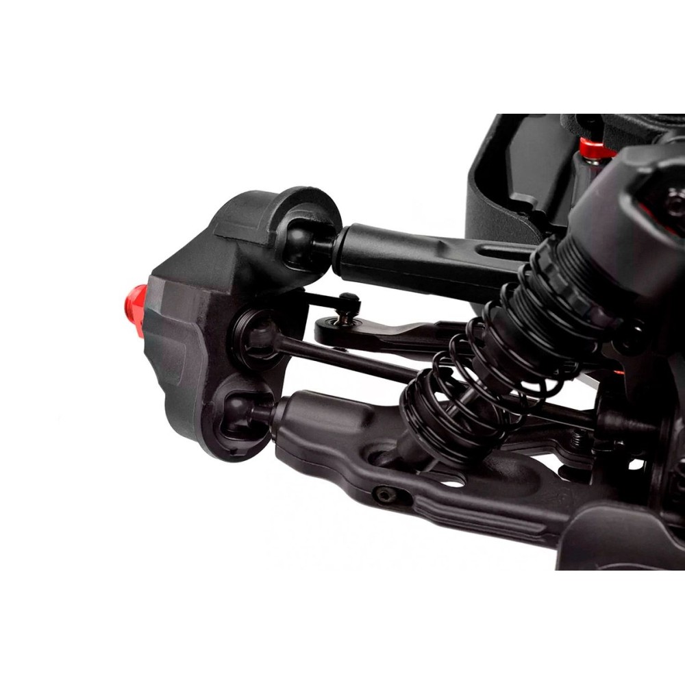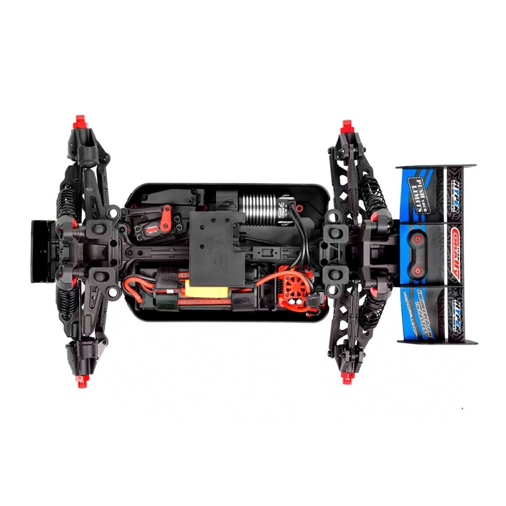 Jeho hybridní hliníkový držák motoru nabízí tři polohy motoru pro přesné nastavení vůle pastorku. Zesílené hnací ústrojí s ocelovými unašeči a robustním hlavním převodovým převodem 52T zajišťuje dlouhou životnost. Široké těhlice z Kagamy a Sketeru dodávají stabilitu a schopnosti v terénu, zatímco nové wheelie kolečko pomáhá zvládat obrovský výkon. Od střídavého motoru Kuron 725 až po regulátor Torox 135 - každá součástka přispívá ke vzrušující maximální rychlosti přes 80 km/h. Vysílač CT2S 2,4 GHz, systém vyztužení podvozku a křídlo s vysokou přítlačnou silou doplňují balíček, takže Punisher4 je skutečným důkazem odkazu inovací a výkonu firmy Team Corally.