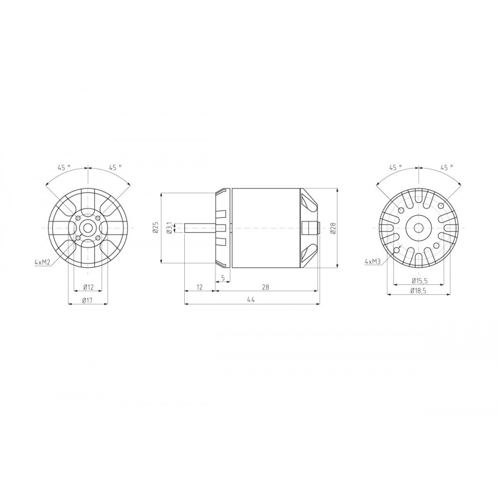 Montáž motoru: KAVAN C2830-1050 je konstruován pro přední i zadní montáž. Při přední montáži za čelo motoru použijte nejméně dva (protilehlé), nebo čtyři šrouby M3, které zasahují do čela motoru v rozmezí 3 - 4 mm. Páry otvorů pro upevňovací šrouby v čele motoru jsou rozmístěny pravidelně o 180° na kružnicích o průměru 16 a 19 mm. Motorová přepážka by měla být z 2-3 mm letecké překližky. Sada pro zadní montáž (upevňovací kříž, unašeč vrtule pro zadní motáž) je dodávána spolu s motorem.