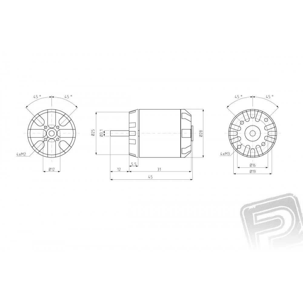 Montáž motoru: FOXY G3 C2212-1000 je konstruován pro přední i zadní montáž. Při přední montáži za čelo motoru použijte nejméně dva (protilehlé), nebo čtyři šrouby M3, které zasahují do čela motoru v rozmezí 3 - 4 mm. Páry otvorů pro upevňovací šrouby v čele motoru jsou rozmístěny pravidelně o 180° na kružnicích o průměru 16 a 19 mm. Motorová přepážka by měla být z 2-2,5 mm letecké překližky. Sada pro zadní montáž (upevňovací kříž, unašeč vrtule pro zadní motáž) je dodávána spolu s motorem.