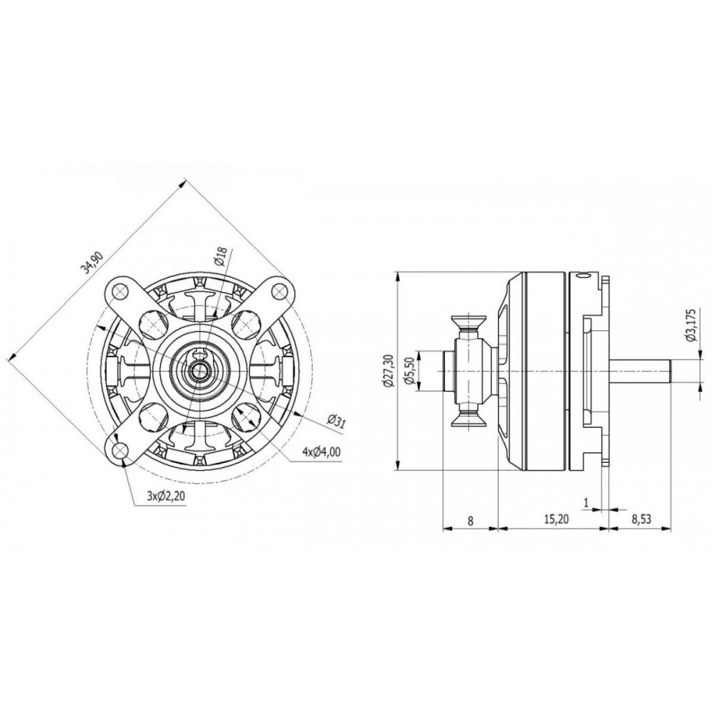 Montáž motoru: AXI 2203/RACE SAVER V2 je konstruován pro přední montáž s pomocí trojice patek na předním čelu. Motorová přepážka by měla být z 1-1,5 mm letecké překližky.