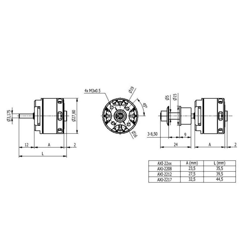 Střídavý elektromotor s rotačním pláštěm nové generace pro modely větroň do 1200g, trenér do 1100g, akro do 1000g, 3D 850g, napájení Lixx 2-3s, hřídel 3,17 mm, regulátor 30-45A.