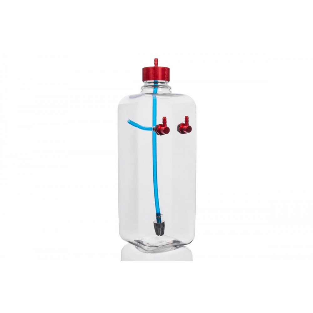 Palivová nádrž FlowMaster 1000 ml z odolného čirého plastu pro benzín. Eloxovaná hliníková zátka s integrovaným sacím hrdlem, mosazné fitinky a sací závaží. Rozměry 229x89x76,5 mm.