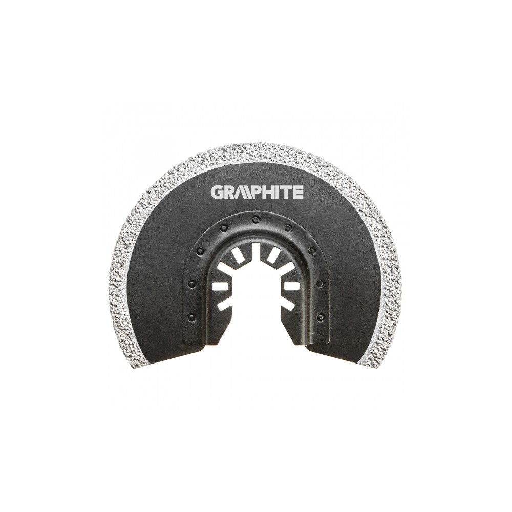 Půlkulatý pilový kotouč pro multifunkční nástroj, HM - zrno karbidu wolframu, pro keramiku, průměr 85 mm Půlkruhový kotouč k řezání keramiky GRAPHITE (ref. č. 56H004) s průměrem 85 mm s posypem z karbidu wolframu. Při použití multifunkčního nářadí GRAPHITE umožňuje přesné přímočaré řezání obkladaček a odstraňování spár.