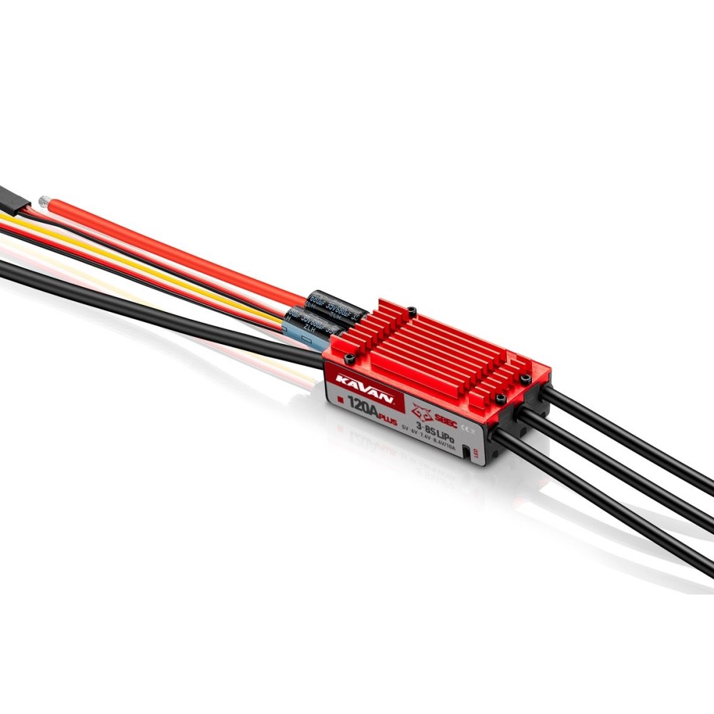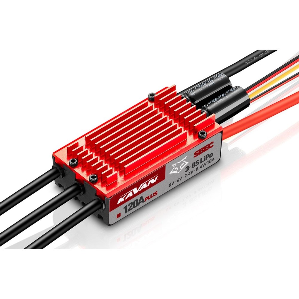 Nová verze základní řady regulátorů KAVAN pro modely letadel s rozšířenými možnostmi programování. Trvalý proud 120 A, špičkový proud 150 A. Spínaný UBEC 5/6/7,4/8,4 V max. 10 A. Napájení 3–8S LiPo. Hmotnost 117 g. Rozměry 85x32x22 mm.