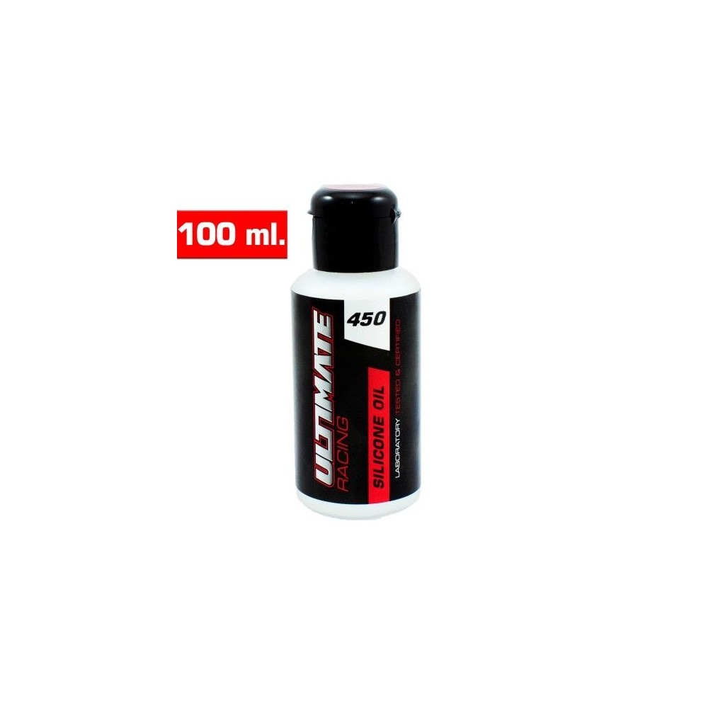 Jedná se o 100 ml lahvičku silikonového oleje Ultimate Racing 450 cSt, který se používá do olejových tlumičů. Tlumičový olej Ultimate Racing je vyroben ze 100% čistého silikonového oleje a v horkém počasí nezřídne a v chladném počasí nezhoustne. Čím vyšší je viskozitní číslo oleje, tím je olej hustší. Silikonový olej Ultimate Racing obsahuje aditiva proti tření, která zajišťuje životnost tlumičů a minimalizují změny viskozity.