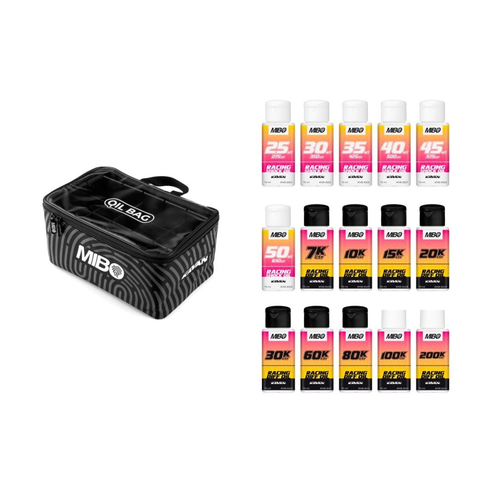 Sada silikonových olejů pro tlumiče a diferenciál ve viskozitách, které jsou nejvíce používané pro off-road závody. Včetně praktické nylonové tašky.
