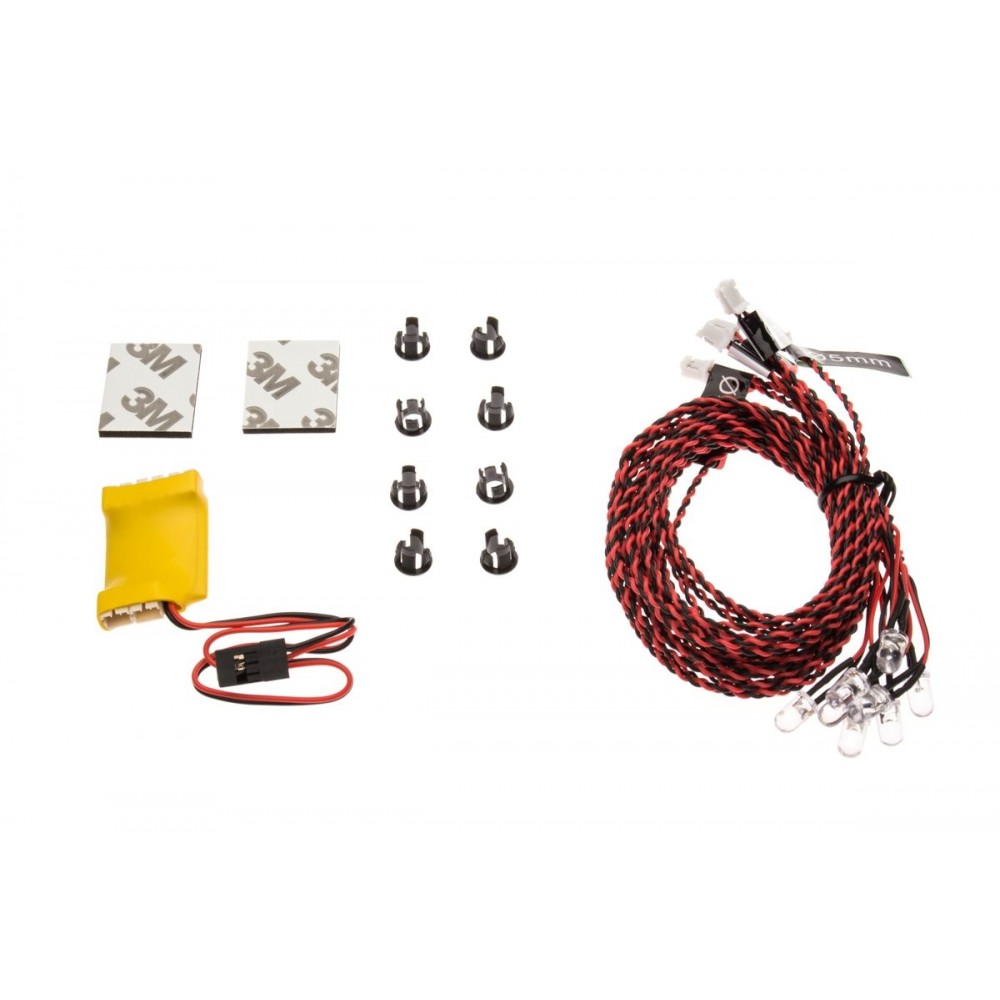 Sada LED osvětlení se skládá z řídící jednotky a osmi 5 mm LED s vysokou svítivostí na 600 mm kabelu: 2x trvale svítící bílá (přistávací světla), 1x trvale svítící zelená (pravé poziční světlo), 1x trvale svítící červená (levé poziční světlo), 2x pomalu blikající červená (červený výstražný maják pro SOP/příď), 2x záblesková bílá (antikolizní maják). Sadu můžete použít i pro malé modely lodí, kde využijete levé červené a pravé zelené poziční světlo a trvale svítící bílá světla na stěžeň.