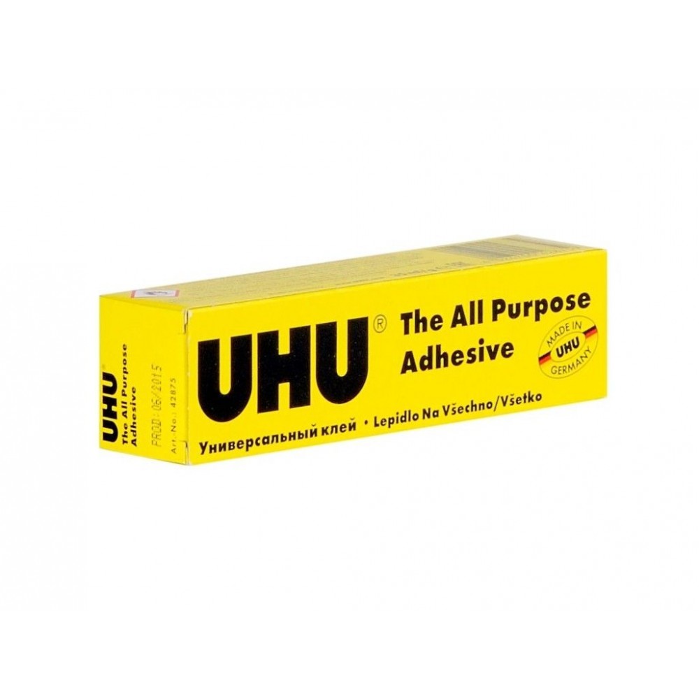 Lepí porcelán, dřevo, kovy, sklo, keramika, plexisklo, plsť, kůže, korek, textil, kartón, papír – UHU univerzální lepidlo lepí prostě všechno. Nevhodné na pěnový polystyren, PP a PE.