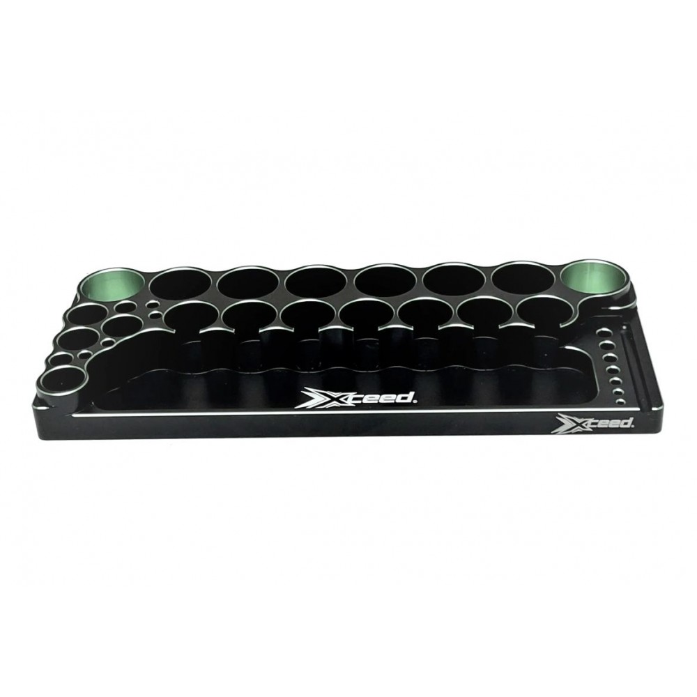 Jedná se o profesionální multifunkční stojánek na nářadí s integrovaným zásobníkem na díly. Xceed hliníkový stojánek na nářadí má několik obrobených otvorů pro nářadí a otvory o menším průměru pro uložení různých přípravků, jako jsou výstružníky karoserie, nářadí pro spojovačky, kleště, nůžky, pinzety, měřidla, lepidlo, fixy/tužky nebo jiné nástroje pro vaše RC podvozky. Integrovaná přihrádka na díly je skvělá pro držení nejrůznějších šroubů, matic, sponek pro karoserii, ale také drobného příslušenství, opěrných bloků, pájky, olejů, tuků a dalších. Tento skvěle navržený praktický stojan na nářadí vám pomůže udržet váš pracovní stůl uspořádaný, profesionální a vyniknout na něm.