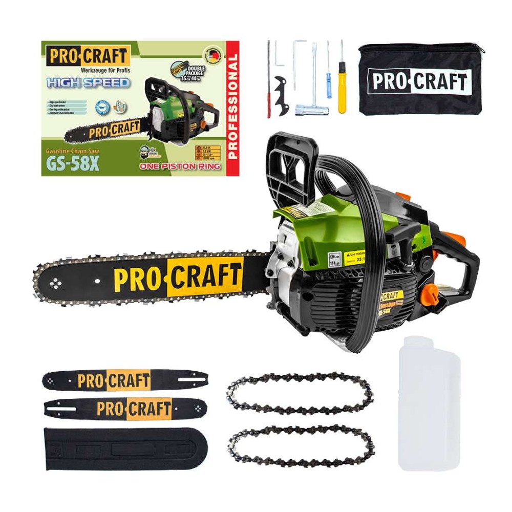 Benzínová řetězová pila Procraft GS-58X vysokorychlostní pro širokoý rozsah prací s výkonem 1,4kW a objemem 37cm3.