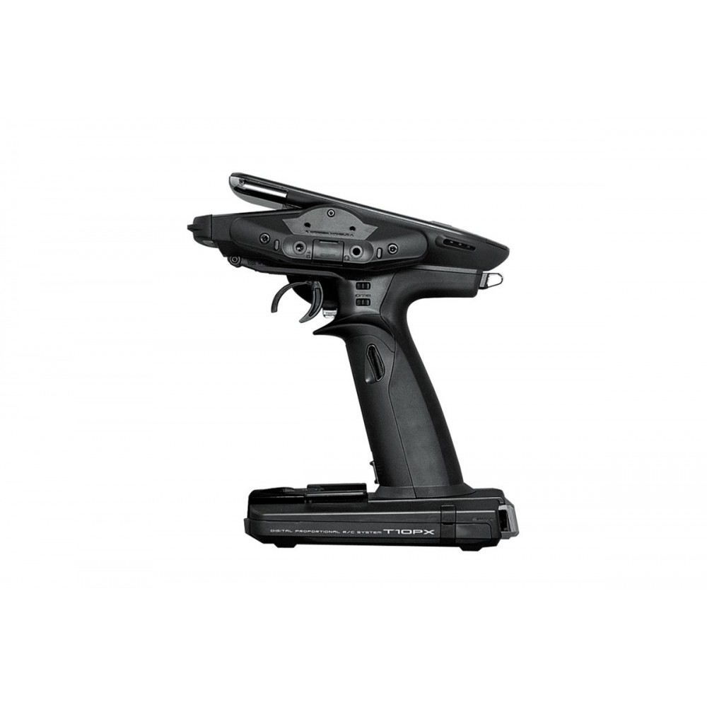 Vysílač T10PX v klasickém volantovém designu s rukojetí dokonale padnoucí do ruky je vybaven volantovým ovladačem řízení, spouští pro ovládání plynu, osmi tlačítkovými přepínači, jedním otočným ovladačem kombinovaným s tlačítkovým přepínačem a šesti digitálními trimy (4 okolo volantu, 2 na rukojeti). Ovládací prvky jsou uspořádány (popř. zdvojeny) pro ovládání praváky i leváky (s volantem přemístitelným na levou nebo pravou stranu). Volant i spoušť plynu mají bohaté možnosti mechanického nastavení pro dokonalé přizpůsobení vašim rukám a stylu řízení. K programování slouží dvojice tlačítek a velký podsvícený barevný dotykový LCD displej zajišťující snadnou orientaci v intuitivním menu. T10PX má paměť pro 40 modelů neomezeně rozšiřitelnou pomocí mikroSD karty a širokou škálu pokročilých programových funkcí pro běžné i speciální modely aut - např. nezávislé řízení a pohon (se 2 regulátory) předních i zadních kol pro crawlery, dvojokruhové brzdy pro velké modely 1:5, gyro pro drifting, ABS, kontrola trakce, mix pro tanky apod. Můžete přepínat až 4 jízdní režimy s odlišným nastavením mnoha programových funkcí zaručující ideální přizpůsobení nastavení auta podmínkám na různých místech závodní trati nebo měnícím se povětrnostním podmínkám atd.