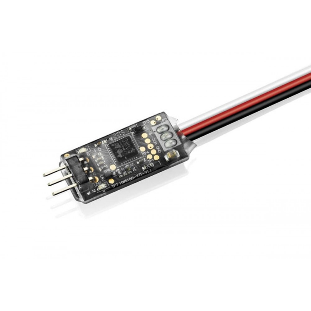 S.BUS2 telemetrický adaptér umožňující přenos telemetrických dat z regulátorů Hobbywing (podporujících přenos dat v reálném čase - některé z řady Platinum V4/V4.1/V5 a některé XERUN) do telemetrických přijímačů Futaba s S.BUS2 portem a následné zobrazení na displeji vysílače Futaba. Napájení 5-9V, rozměry 25x13x6mm, hmotnost 3,5g.