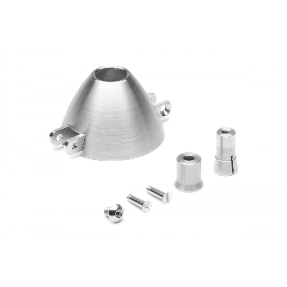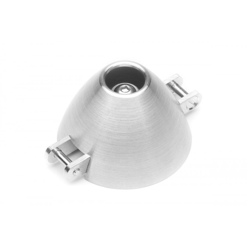 Precizní duralový TURBO kužel pro sklopnou vrtuli o průměru 45 mm s kleštinou 5,0mm, s 3 mm čepy pro vrtulové listy s kořenem o tlouštce 8 mm. Vyrobeno v České republice.