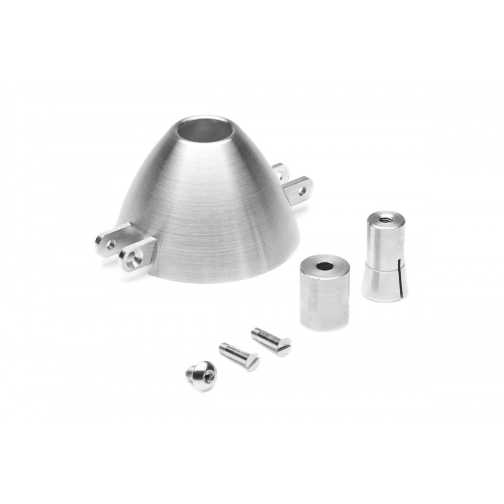 Precizní duralový TURBO kužel pro sklopnou vrtuli o průměru 50 mm s kleštinou 8,0mm, s 3 mm čepy pro vrtulové listy s kořenem o tlouštce 8 mm. Vyrobeno v České republice.
