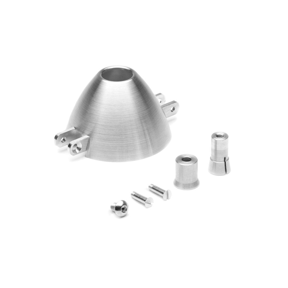 Precizní duralový TURBO kužel pro sklopnou vrtuli o průměru 50 mm s kleštinou 5,0mm, s 3 mm čepy pro vrtulové listy s kořenem o tlouštce 8 mm. Vyrobeno v České republice.