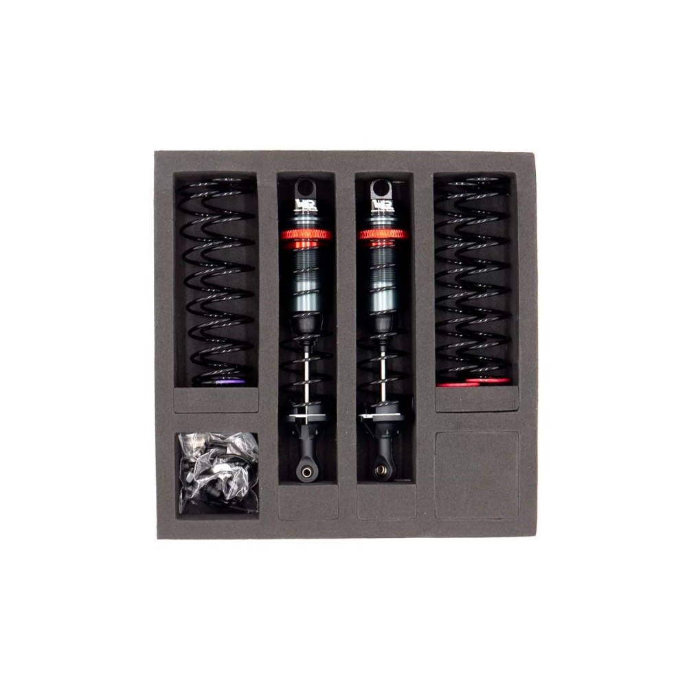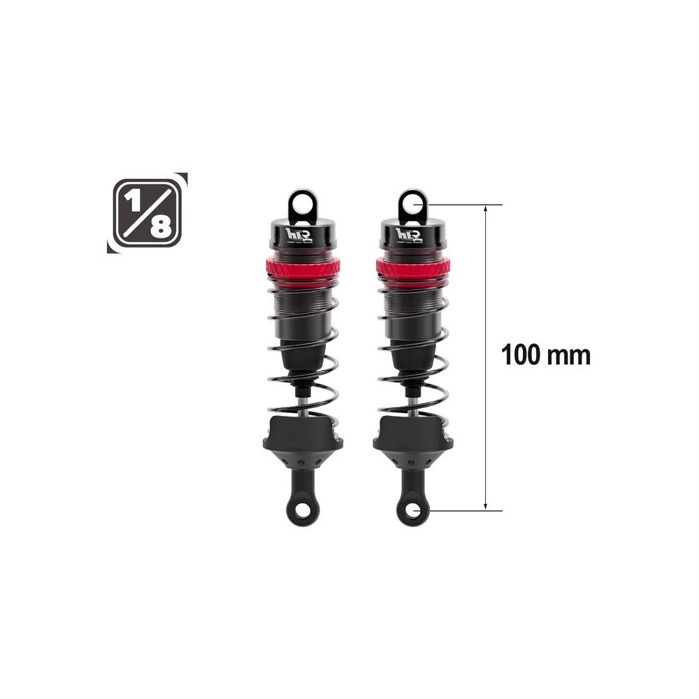 Celohliníkové olejové tlumiče pro modely 1/8 a podobné, Celková délka mezi čepy je 100mm, průměr pístku je 16mm. Sada obsahuje: tři páry pružin: měkké, střední a tvrdé; horní i spodní upevňovací materiál.